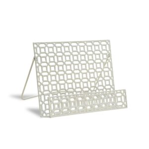 This petite book stand is perfect for cookbooks. It features a folding easel back and 2″/5cm deep shelf. The finish is a smooth powder coated creamy white paint with a slight shine to sparkle with any countertop.