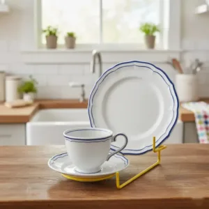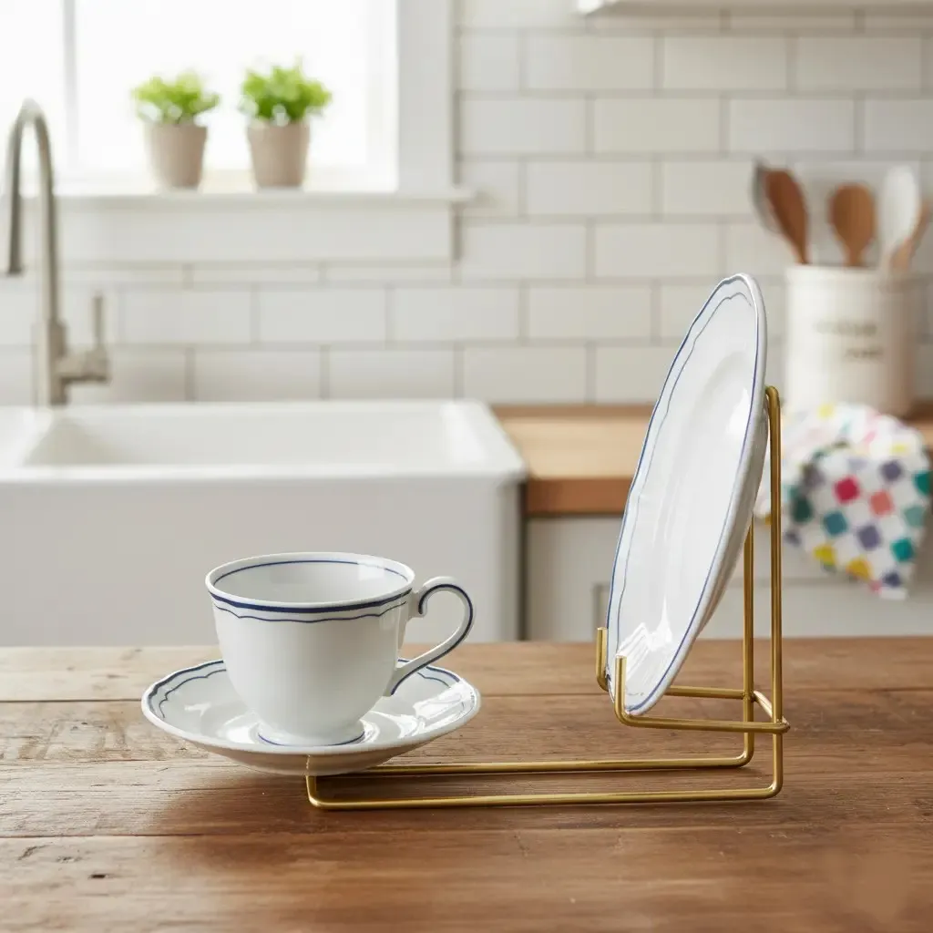 Can also be used as a cup and saucer stand or a plate and mug stand. Available in Gold and White.