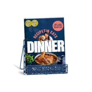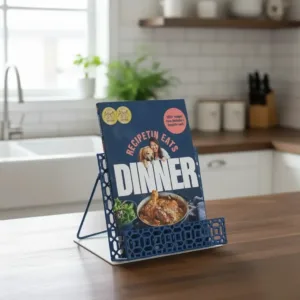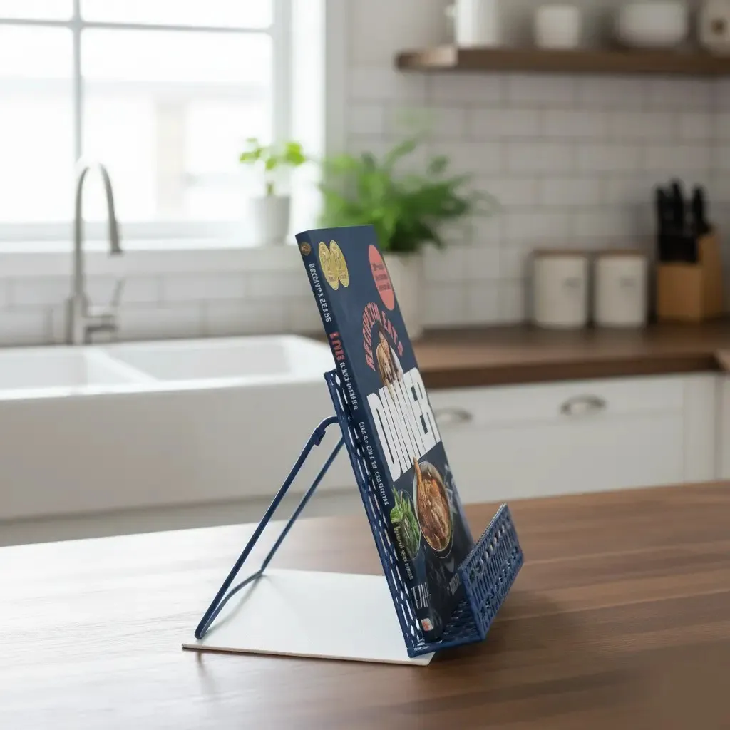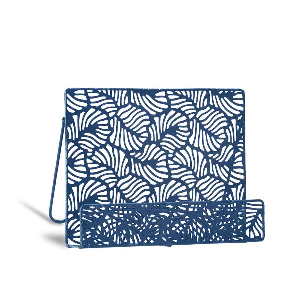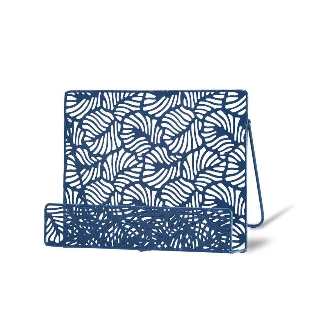 Super stylish metal cookbook stand with a leaf pattern. Features navy blue painted finish with a folding easel back and 2″/5cm deep shelf. Petite sized to fit on any counter or shelf.