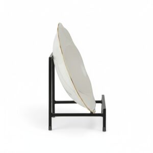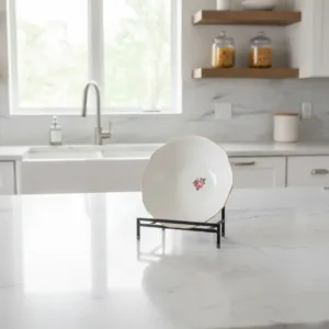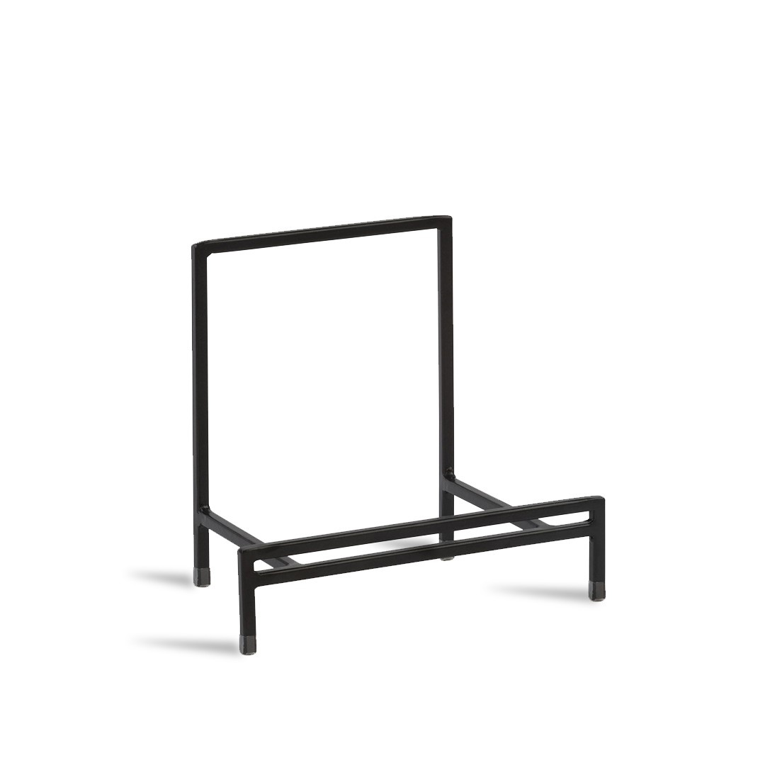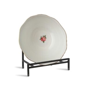 The Straight Edge Bowl Stand offers an updated modern simple design that will go with any decor. It is made of solid square metal with a black finish. It is sturdy and heavy. Perfect for holding heavy or thick ceramic or glass bowls. It is 9″/23cm wide, 5.5″/14cm deep and 8″/20cm tall. The lip depth is 4.75″/12cm. Includes clear tips to protect countertops.