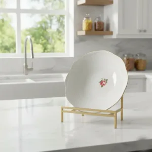 The Straight Edge Bowl Stand offers an updated modern simple design that will go with any decor. It is made of solid square metal with a gold finish. It is sturdy and heavy. Perfect for holding heavy or thick ceramic or glass bowls. It is 9″/23cm wide, 5.5″/14cm deep and 8″/20cm tall. The lip depth is 4.75″/12cm. Includes clear tips to protect countertops.